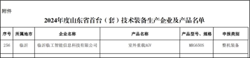 【概要描述】近日,山東省工業和信息化廳正式公布了2024年度山東省首臺(套)技術裝備生產企業及產品公示名單,臨工智科自主研發的65T室外重載AGV順利通過認定。